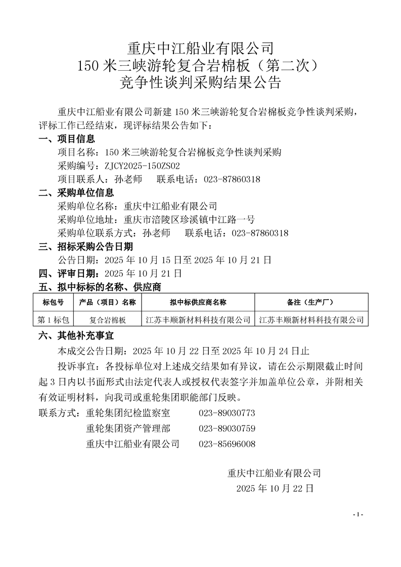 中江船業(yè)150米三峽游輪復(fù)合巖棉板(第二次)競(jìng)爭(zhēng)性談判采購(gòu)結(jié)果公告(采購(gòu)編號(hào):ZJCY2025-150ZS02