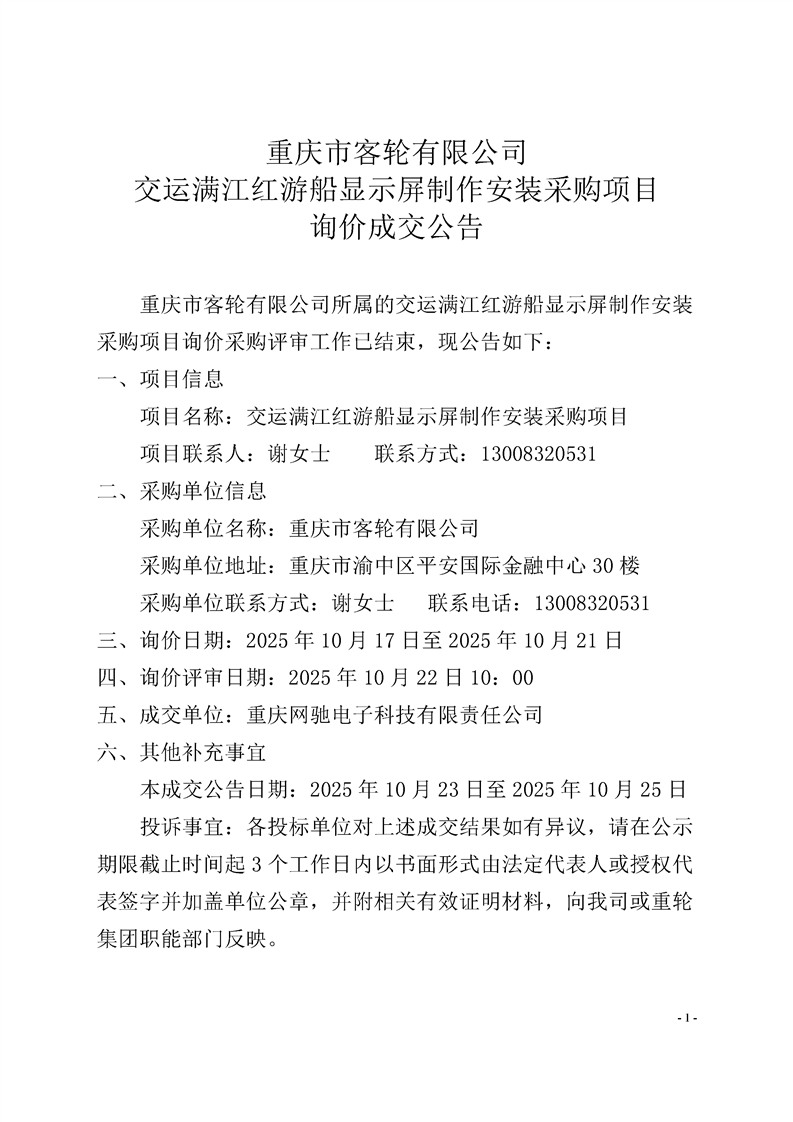 重慶市客輪有限公司交運(yùn)滿江紅游船顯示屏制作安裝采購(gòu)項(xiàng)目詢價(jià)成交公告